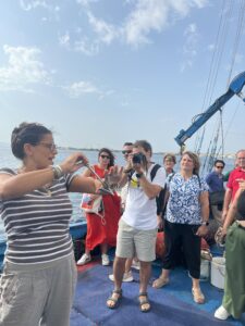 The first day of the study tour began with the most evocative experience: a Feluca excursion to discover the ancient traditions of swordfish hunting in the Strait of Messina. The protagonist of this extraordinary experience was Giusi Arena, owner of the family business that has been dedicated to this ancient art for generations. With passion and expertise, Giusi explained how the company is run by her father and her uncle, who continues to climb the feluca’s mast, demonstrating how traditional knowledge is passed down from generation to generation.